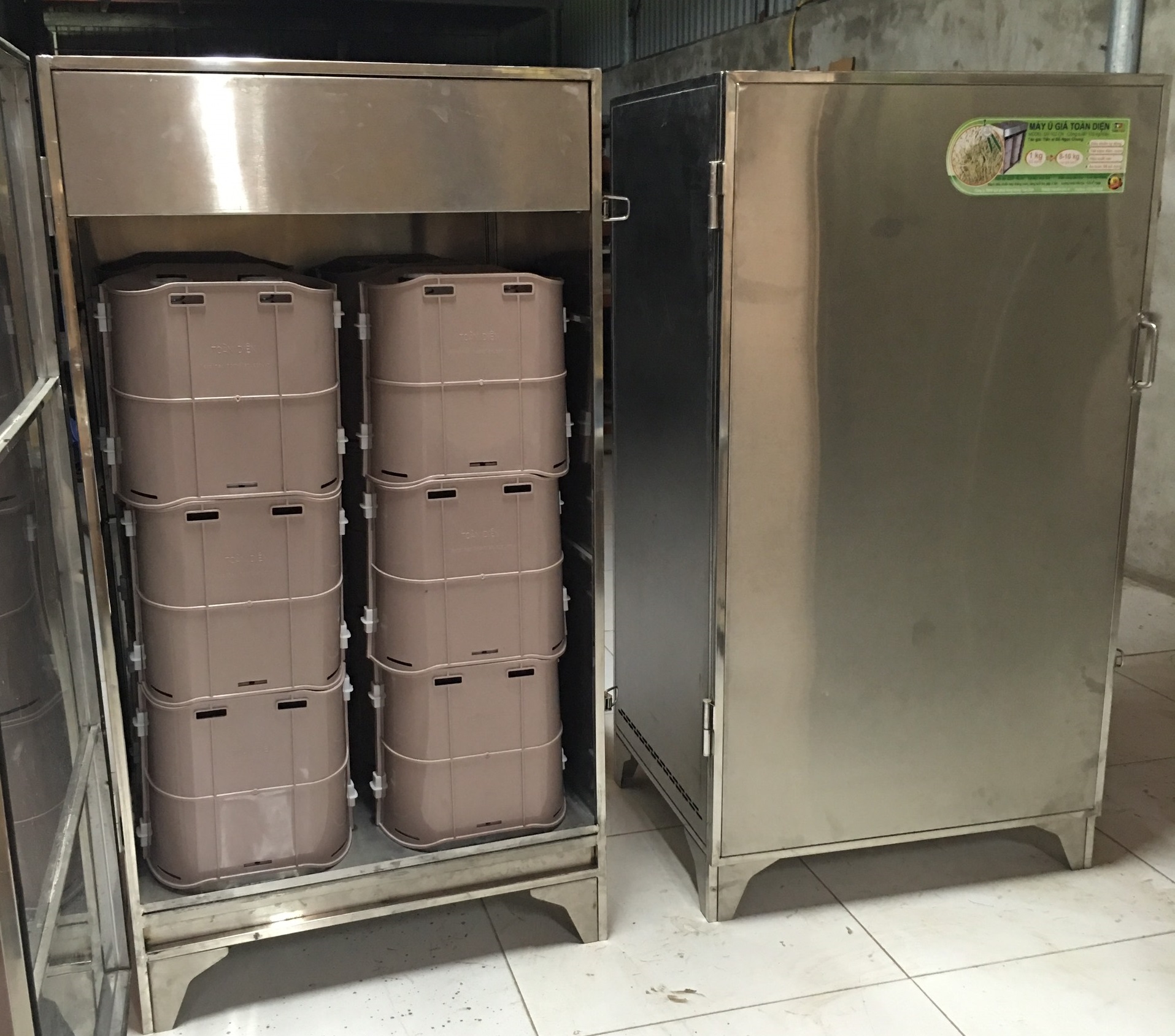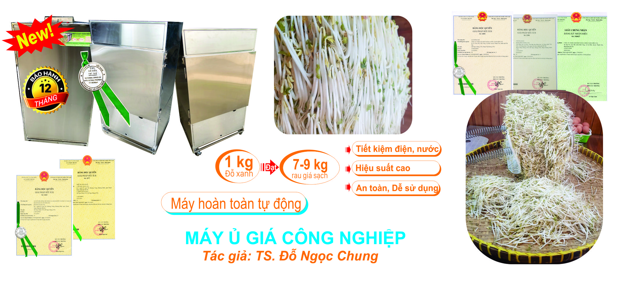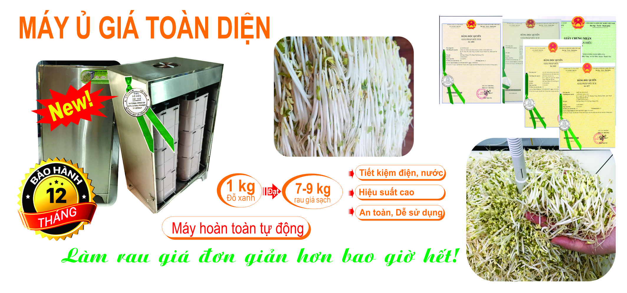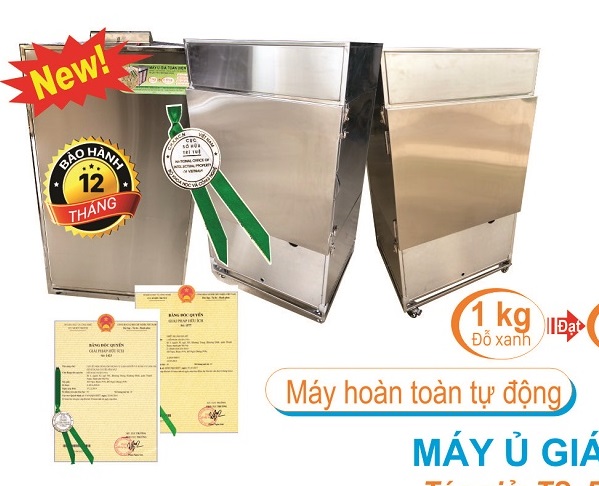 Thiết bị sản xuất rau giá, Điều khiển tự động hoàn toàn, sản lượng 100/150/200/250 kg/mẻ. Tiết kiệm điện, nước, dễ sử dụng. Hiệu suất 1kg đỗ được 7-9 kg rau giá. Thiết bị duy nhất trên thị trường đảm bảo độ nén giúp rau giá mập, sản lượng cao.